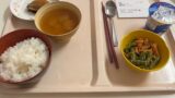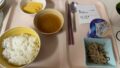 ACL術後10日目の昼食(豚肉と野菜の炒め物・ご飯・スープ・バナナ)