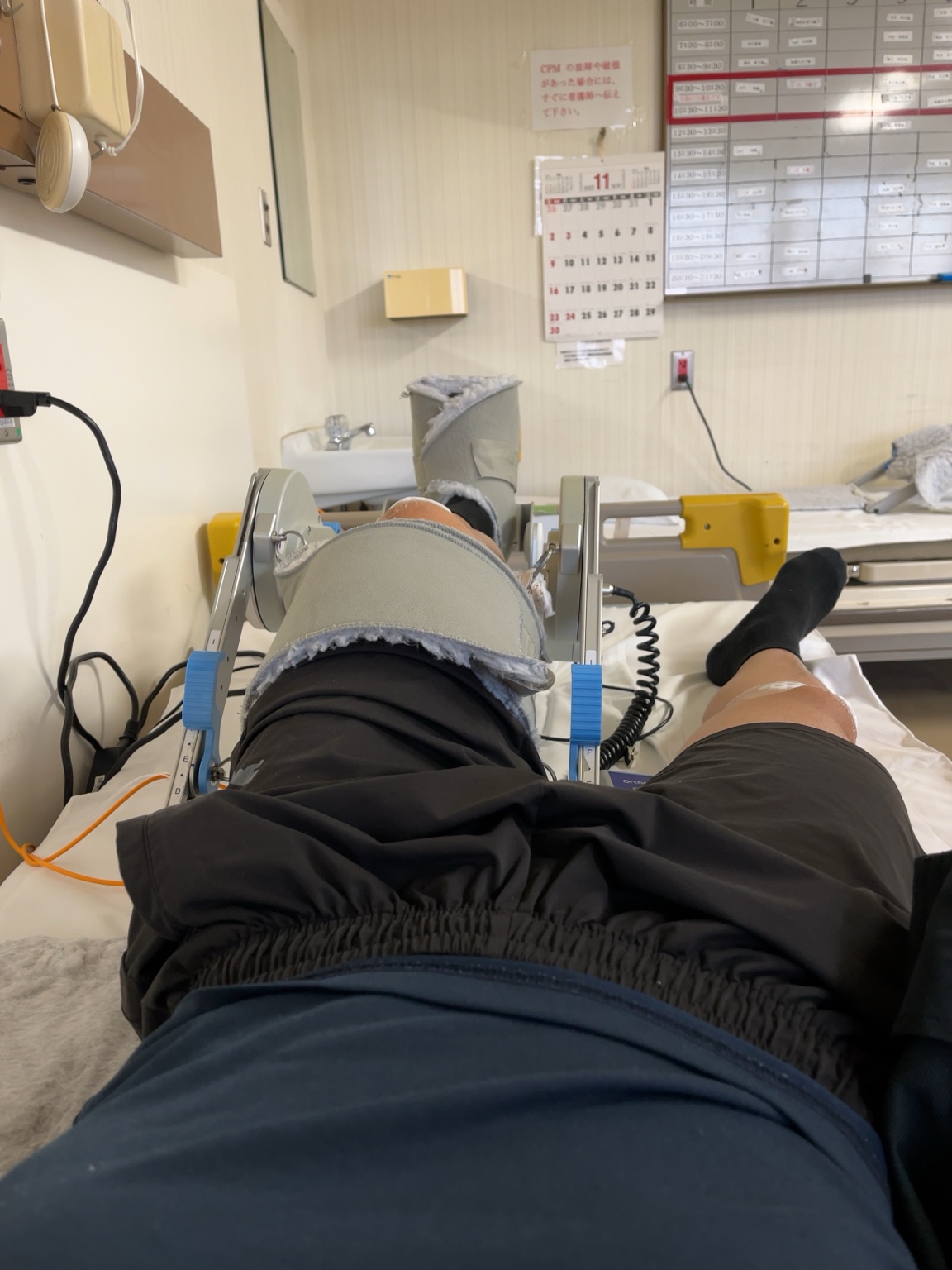 - CPM(膝の自動曲げ伸ばし機)は 7:00〜 と 16:30〜 にそれぞれ1時間ずつ実施。
