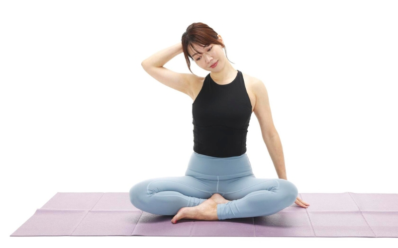 右手で頭を軽く押さえ、首を左に倒します。反対側も同様に。